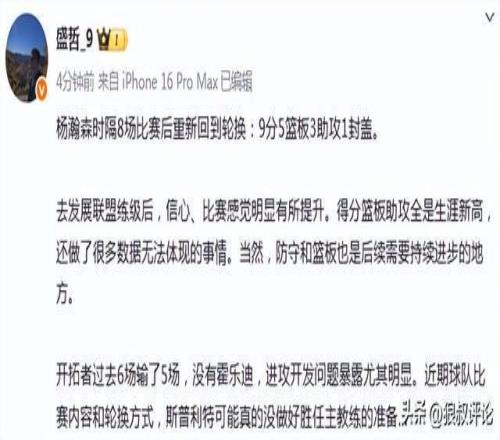 记者盛哲发文点评:“杨瀚森时隔8场比赛后重新回到轮换:9分5篮板3助攻1封盖。