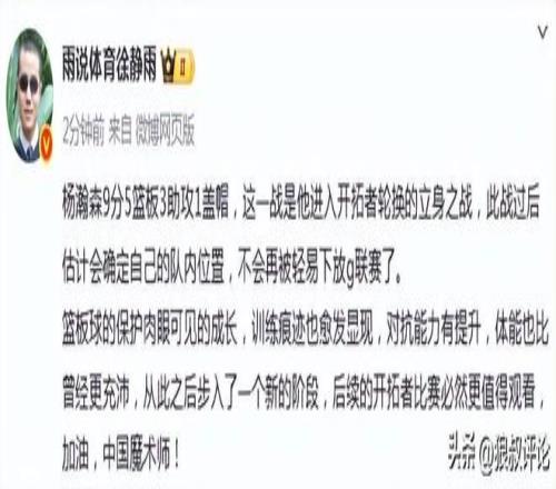 篮球评论员徐静雨发文点评:杨瀚森9分5篮板3助攻1盖帽,这一战是他进入开拓者轮换的立身之战,此战过后估计会确定自己的队内位置,不会再被轻易下放g联赛了。