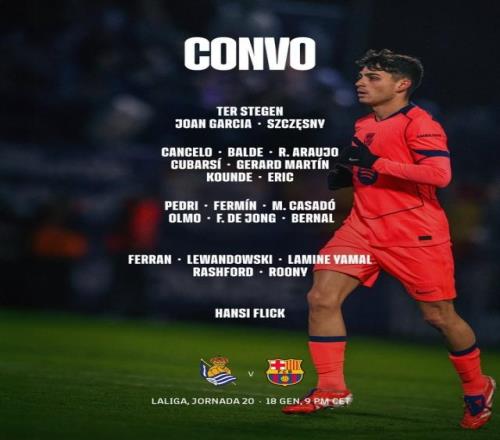 巴塞罗那俱乐部官方宣布,拉菲尼亚因右大腿受伤,出于谨慎考虑他将缺席周日晚作客皇家社会的比赛。 巴萨大名单 门将:特尔施特根、霍安·加西亚、什琴斯尼 后卫:坎塞洛、巴尔德、阿劳霍、库巴西、赫拉德·马丁、孔德、埃里克·加西亚 中场:佩德里、费尔明、卡萨多、奥尔莫、弗伦基·德容、贝尔纳尔 前锋:费兰、莱万、亚马尔、拉什福德、巴尔德吉